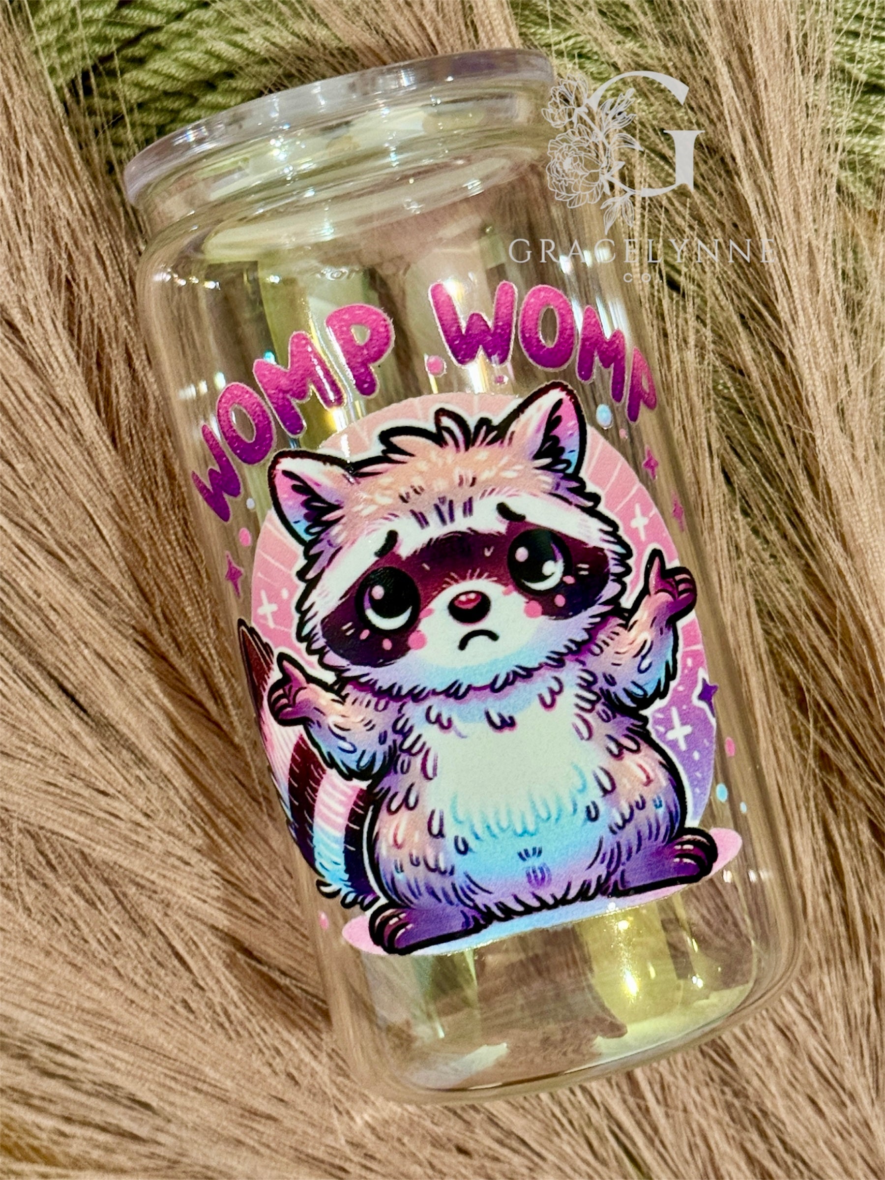 Iridescent Glass can cup with straw.